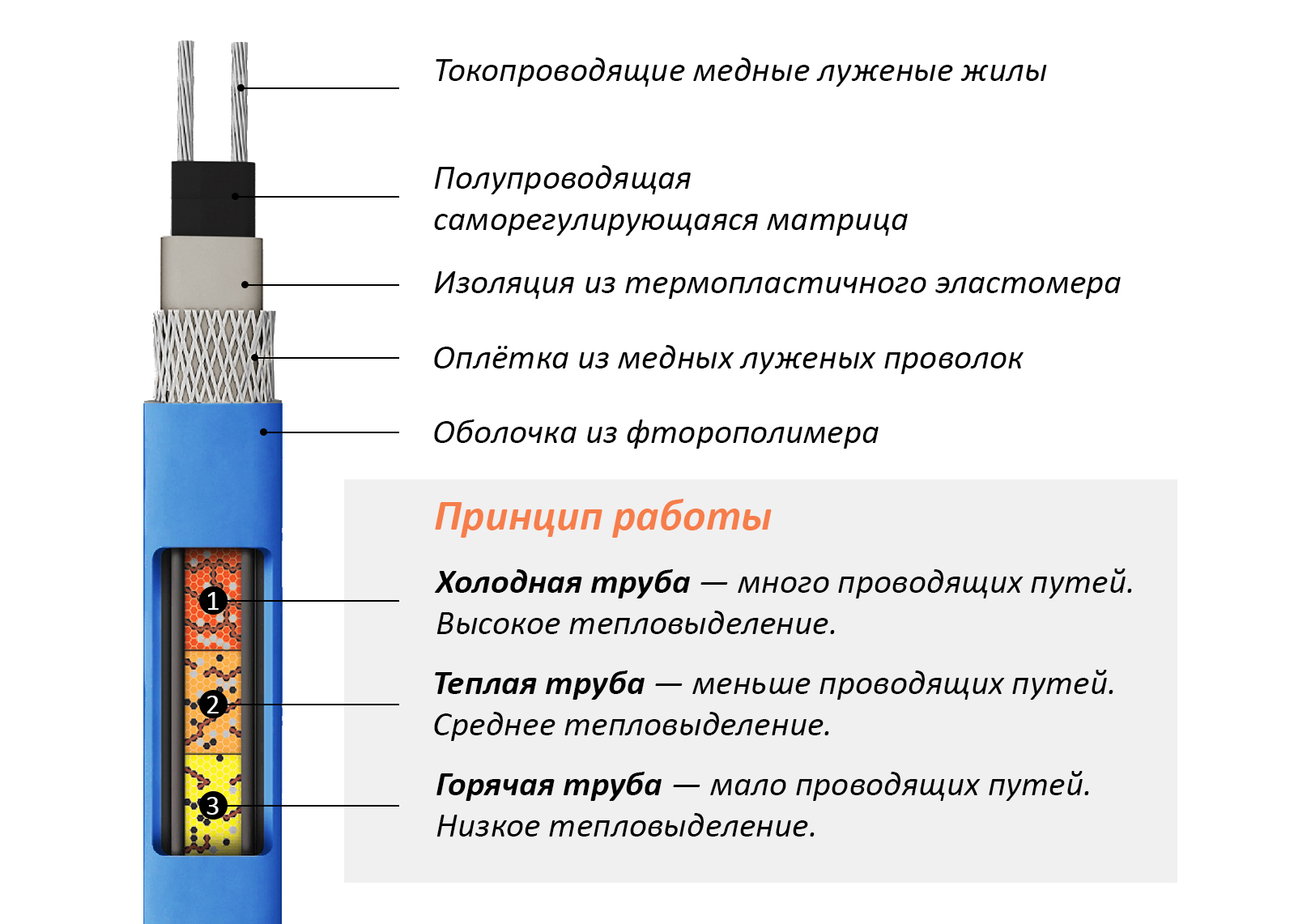Саморегулирующийся кабель — автоматически регулирует мощность, в зависимости от окружающей температуры. Теплоотдача по всей длине кабеля может быть разной. Минимальный риск перегрева.