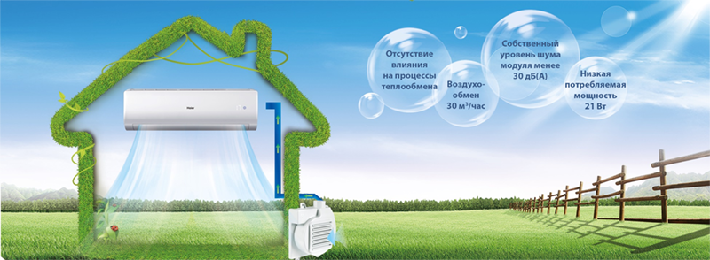 - Модуль O2 Fresh (опция) — дает приток отфильтрованного свежего наружного воздуха объемом 30 куб.м в час. Модуль крепится к стене, на которой закреплен наружный блок, либо на сам блок. Управление функцией производится с пульта ДУ.