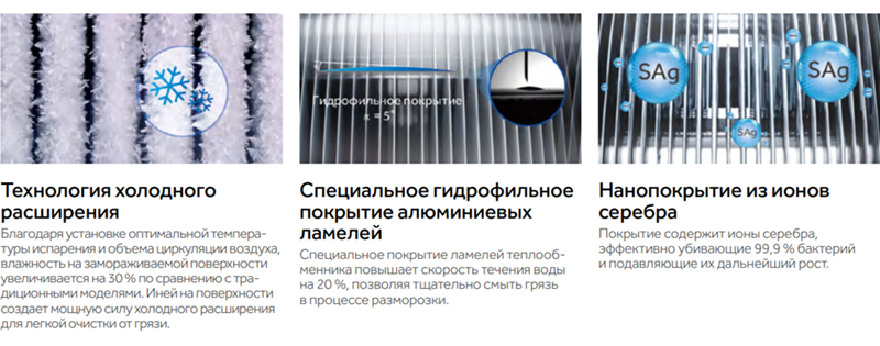 - Self Clean внутреннего и внешнего теплообменника — технология самоочистки, при активации которой поверхность испарителя внутреннего, а затем и внешнего блока сначала замораживается, и при последующей разморозке вся накопившаяся пыль и грязь смываются с поверхности теплообменника и удаляются вместе с конденсатом через дренажное отверстие