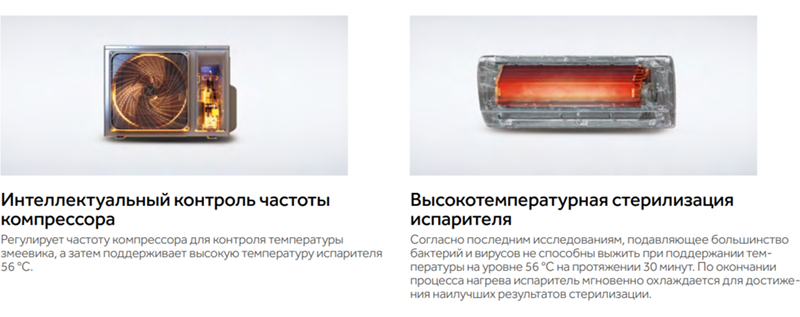Самоочистка + стерилизация внутреннего блока обеспечивают автоматическое удаление влаги и загрязнений, предотвращают размножение бактерий и грибков, UV лампа уничтожает вирусы и микробы, а Ag+ покрытие испарителя препятствует образованию плесени и неприятного запаха, обеспечивая чистоту воздуха и продлевая срок службы устройства.