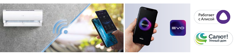- Wi-Fi управление в базовой поставке — управление через приложение EVO, поддержка голосового управления Яндекс Алиса, Салют! Сбер