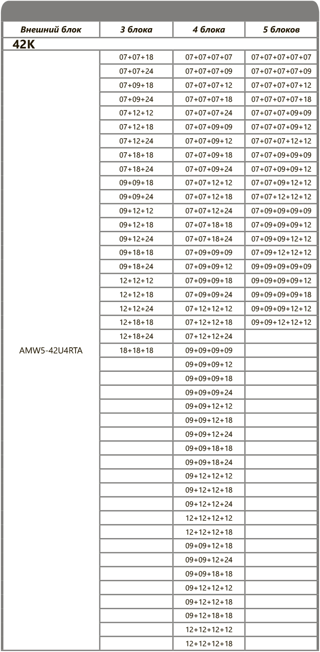 Рассчитан на подключение 5 внутренних блоков. Общая площадь охлаждения до 125 кв.м, комбинации внутренних блоков подбираются индивидуально. Внутренние блоки можно подобрать здесь.