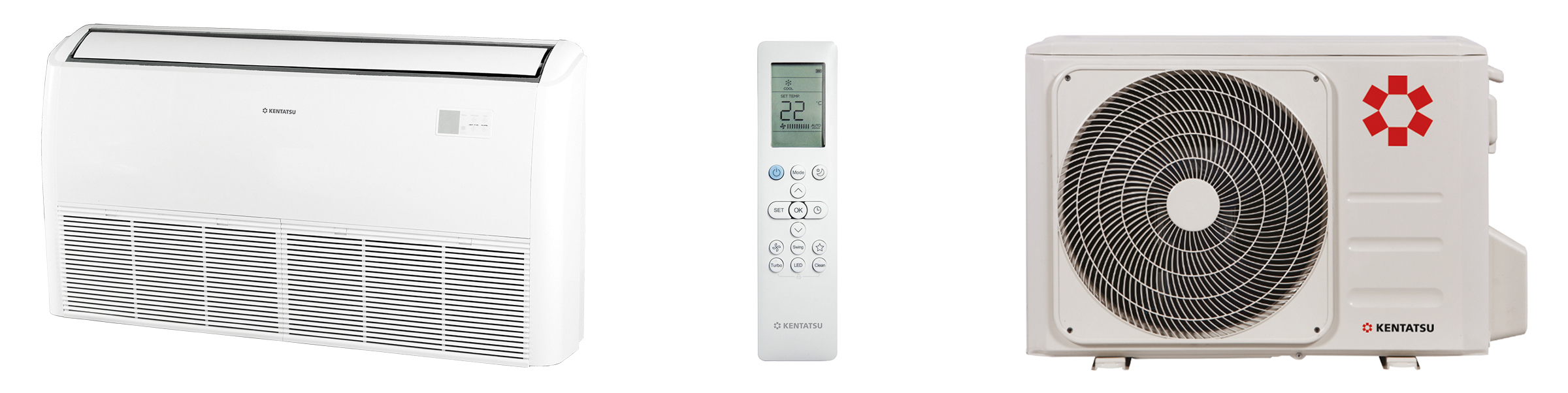Устанавливается на пол или под потолок, рассчитана на охлаждение и обогрев помещения площадью до 50 кв.м.