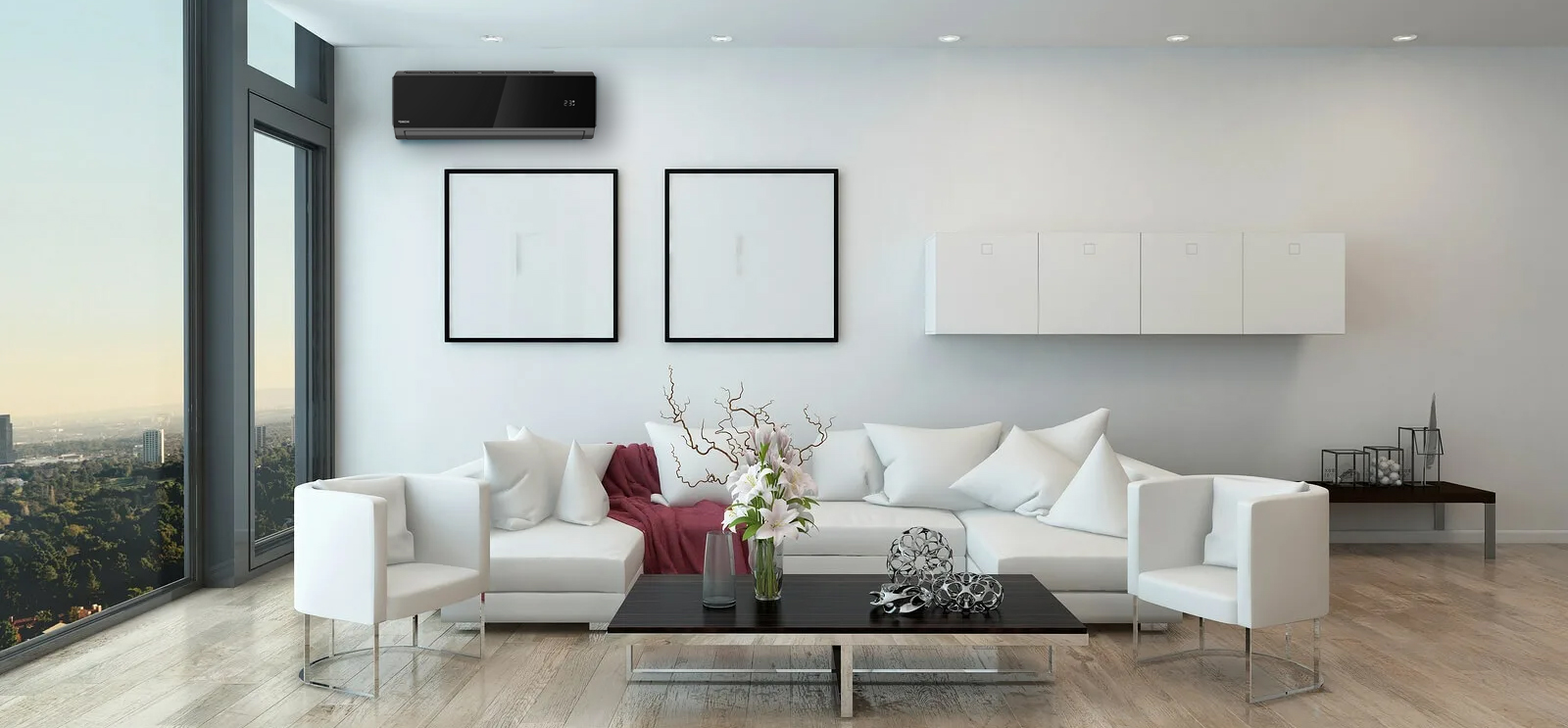 Корпус внутреннего блока имеет глянцевую черную поверхность, напоминающую стекло. Дизайнерский пульт ДУ также выполнен в черном цвете.