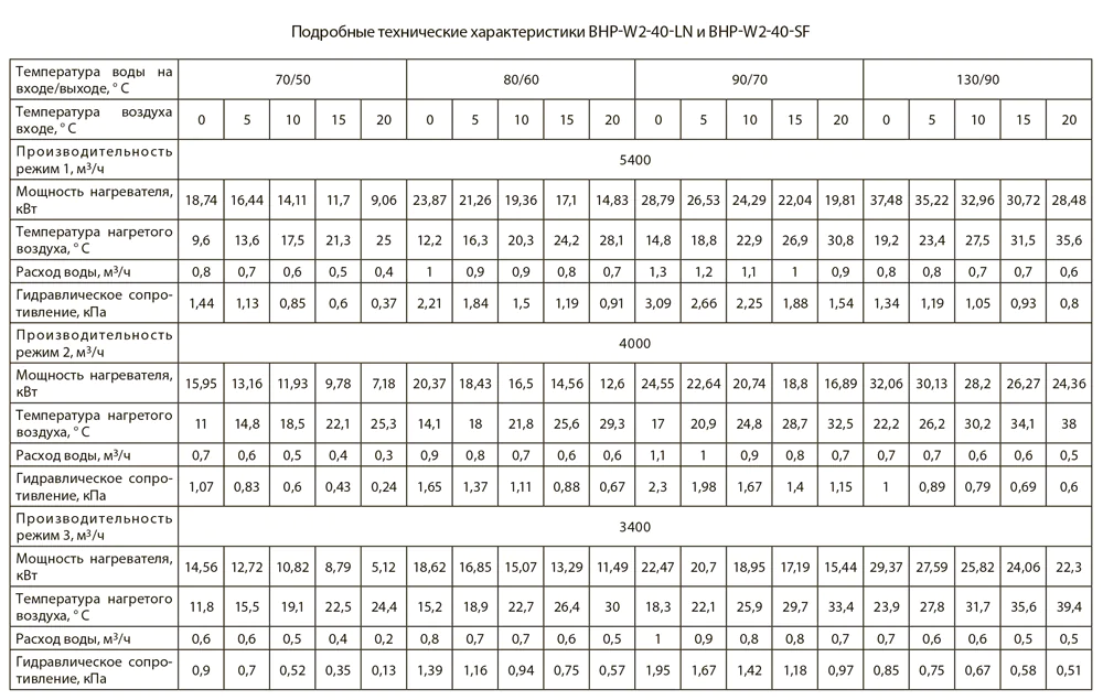 Тепловые характеристики приведены при температуре воздуха на входе +0 °С, максимальном расходе воздуха и максимальной температуре теплоносителя (указанной в таблице тепловой мощности от производителя).