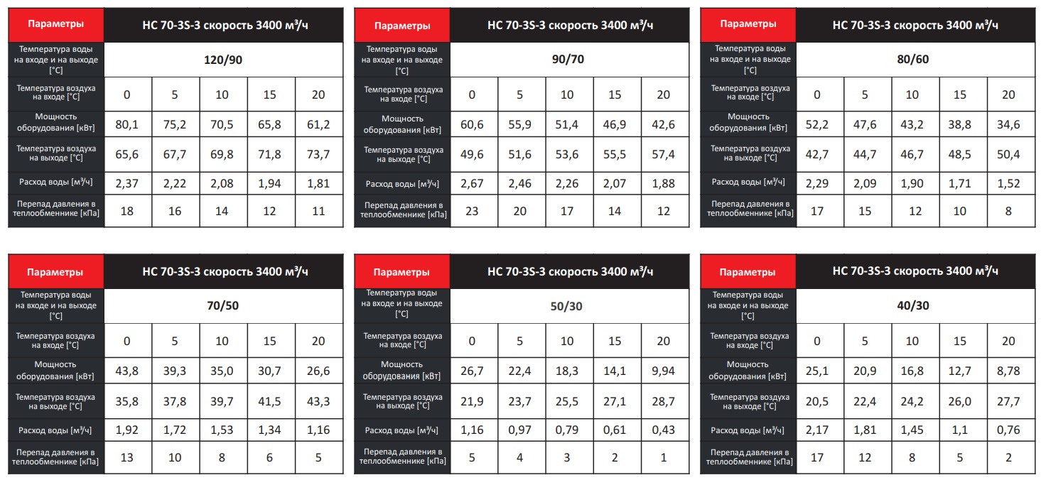 Тепловые характеристики приведены при температуре воздуха на входе +0 °С, максимальном расходе воздуха и максимальной температуре теплоносителя (указанной в таблице тепловой мощности от производителя).