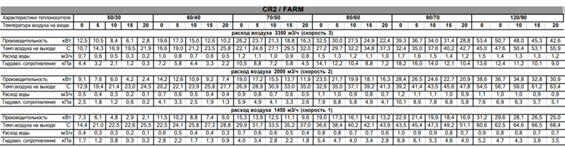 Тепловые характеристики приведены при температуре воздуха на входе +0 °С, максимальном расходе воздуха и максимальной температуре теплоносителя (указанной в таблице тепловой мощности от производителя).
