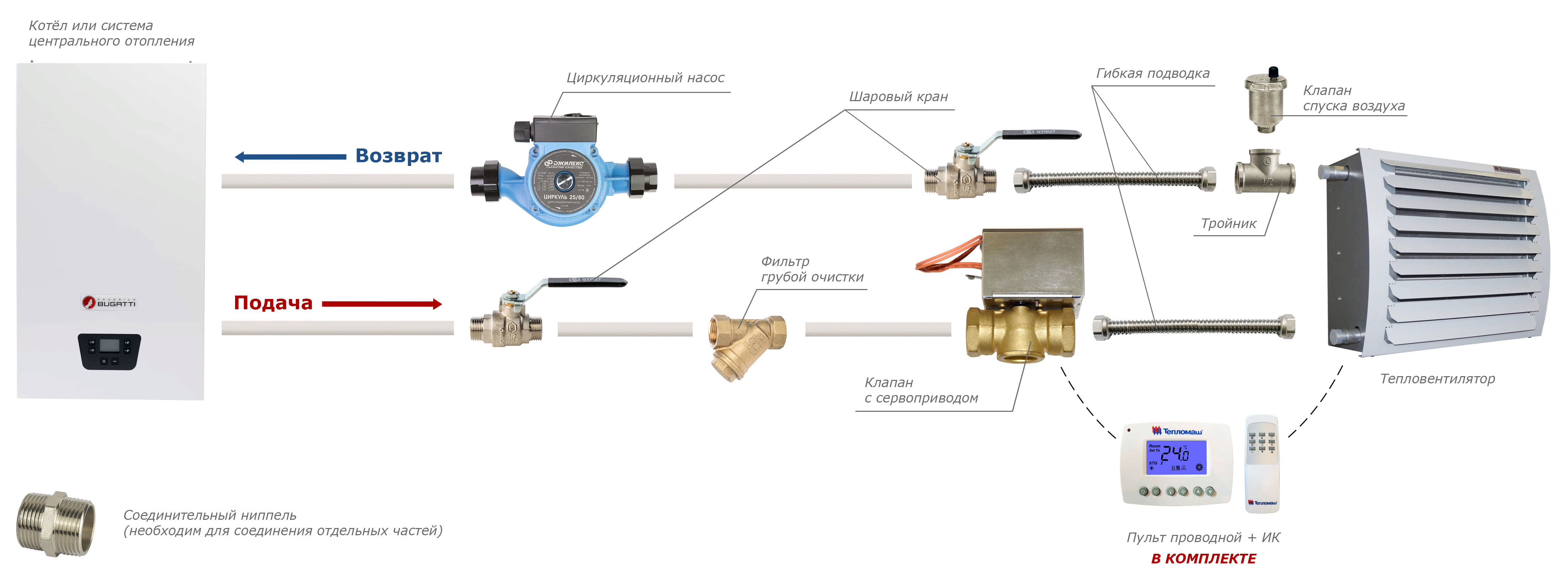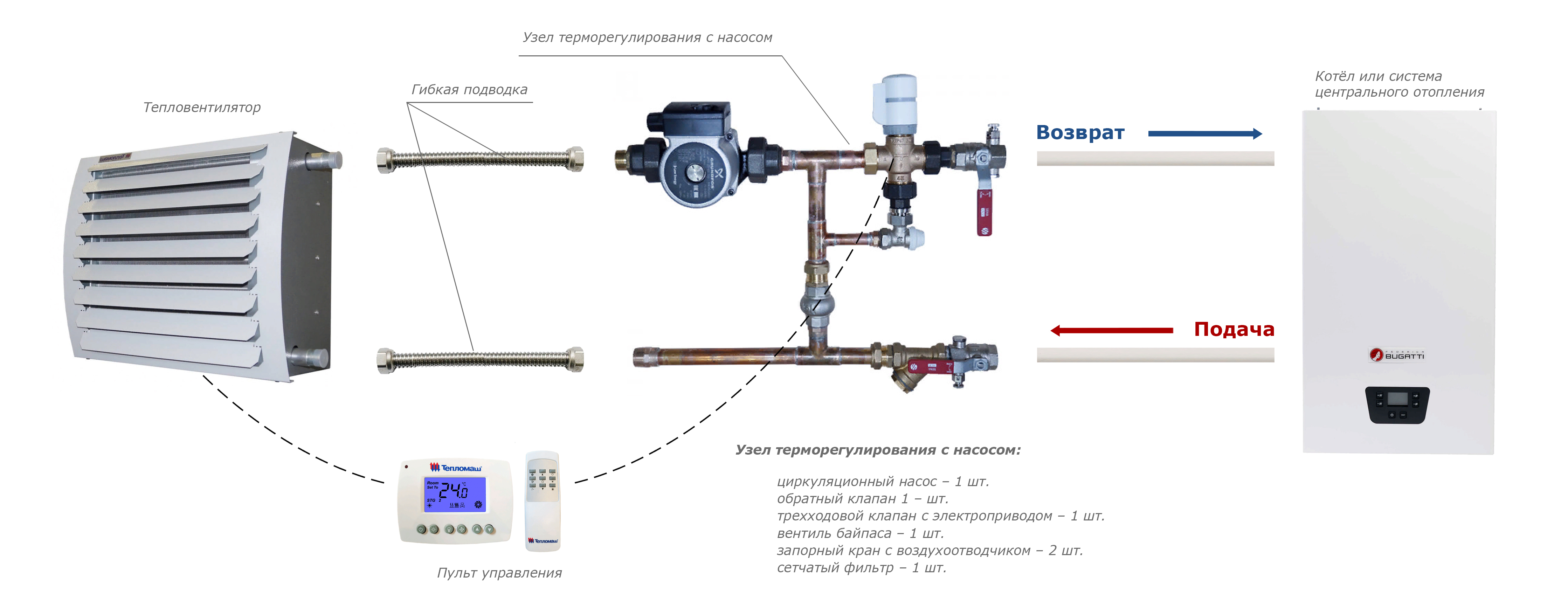 - Стандартная комплектация: тепловентилятор + проводной пульт HL10 с электронным термостатом — поддержание заданной температуры осуществляется за счет включения/выключения вентилятора и его работы на выбранной скорости. При достижении необходимого уровня температуры вентилятор отключается, теплоноситель продолжает циркулировать.