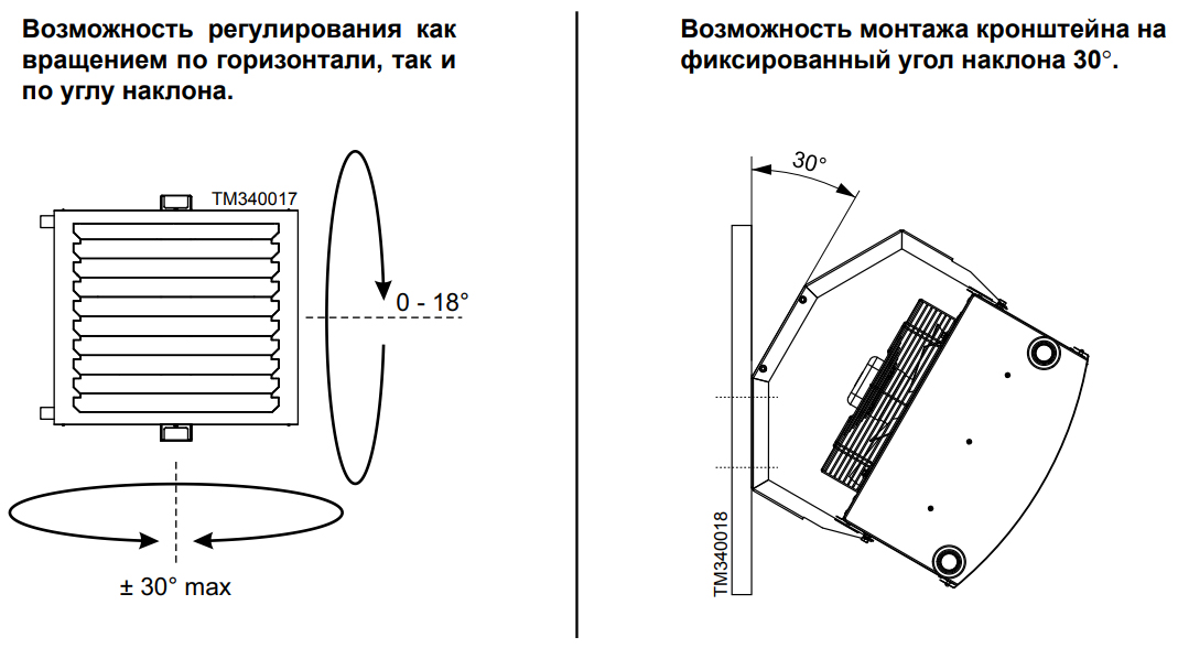 - Универсальный монтаж (вертикальный под углом 30°или горизонтальный с помощью регулируемого кронштейна).
