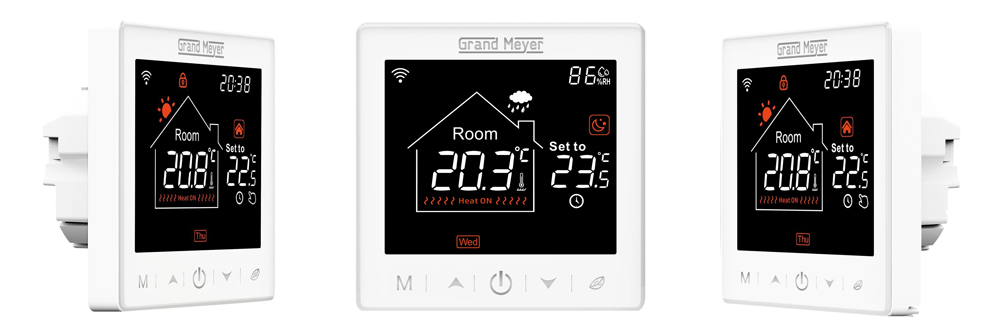 Линейка современных терморегуляторов Grand Meyer SN с функцией удаленного доступа по сети Wi-Fi предназначены для управления системами теплых полов. Укомплектован выносным датчиком температуры пола и оснащен встроенным датчиком температуры воздуха, на основании показаний которых происходит автоматическое поддержание заданной температуры. Устанавливается в стандартный подрозетник. Модель имеет большой информативный сенсорный дисплей, выполнена в 3 цветах – белый, золотой (шампань) и черный.
